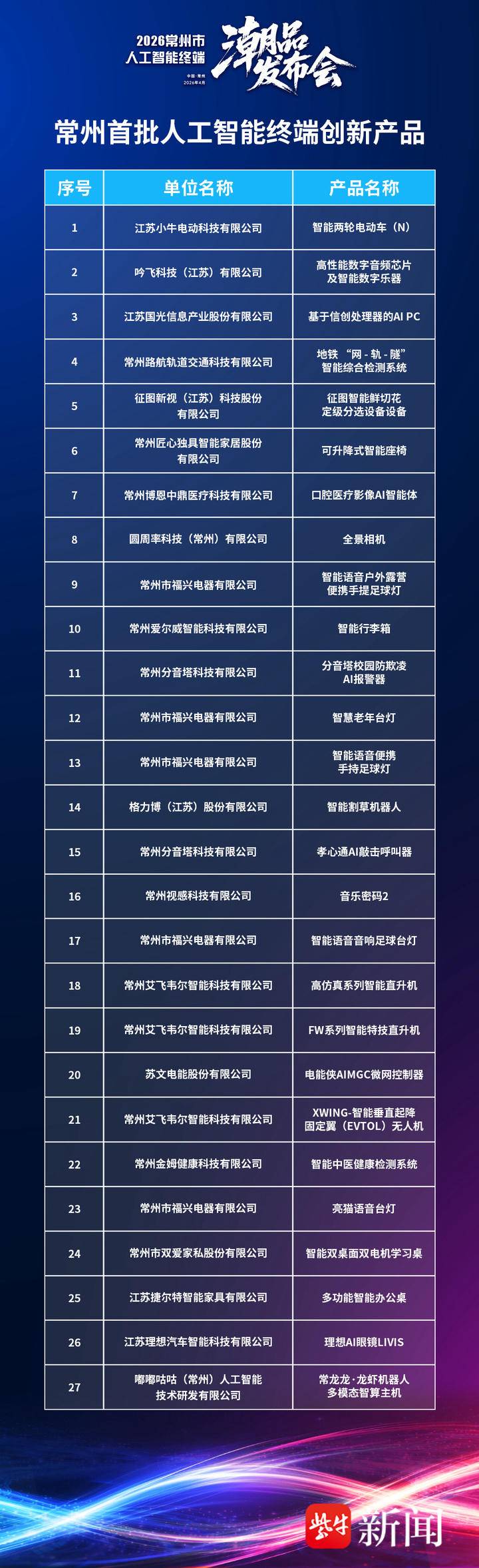 与展会同步,常州市工业和信息化局正式公布首批 “人工智能终端创新产品” 名单,共计27个产品入选,覆盖智能出行、智慧健康、智能家居、智能乐器、AI安防等多个领域。